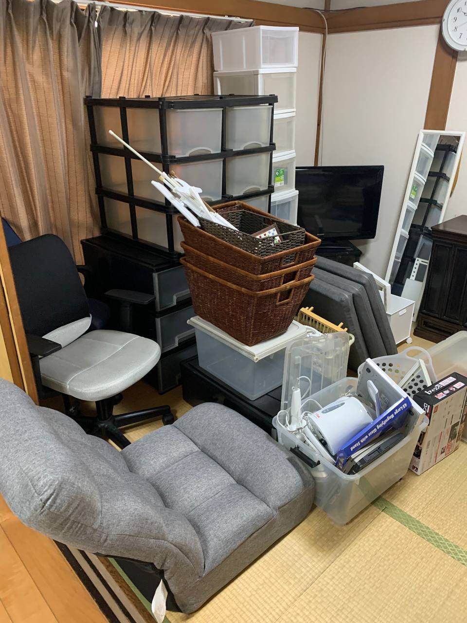 お部屋には、テレビ・冷蔵庫・洗濯機といった大型家電をはじめ、机、仏壇、布団などのお品物が残されている状況でした。
